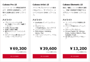 Cubaseは3種類あります。エレメンツ、アーティスト、プロの3つです。それぞれ価格帯とできることが違います。