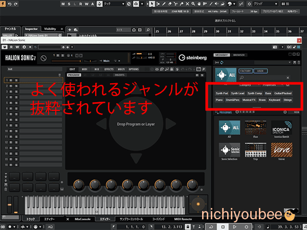 鳴らしたい音のジャンルを選択したら、その後この下の中から実際に使う音を選んでいきます。