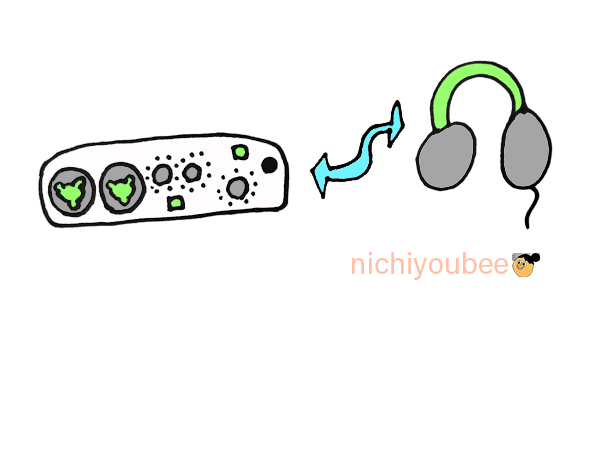 モニターヘッドフォンを繋げるには、オーディオインターフェイスの中にある、差込口にモニターヘッドフォンのコードを繋げる必要があります。